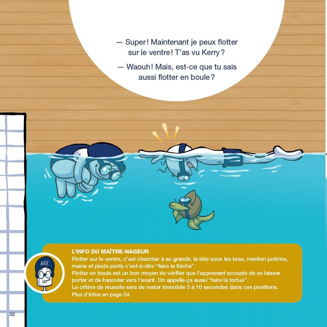 • Pour les adultes car il existe pour chaque situation d’apprentissage des conseils pratiques comme “l’info du maître-nageur” et “pour aller plus loin” qui permet d’approfondir et mieux comprendre les étapes d’apprentissage.
